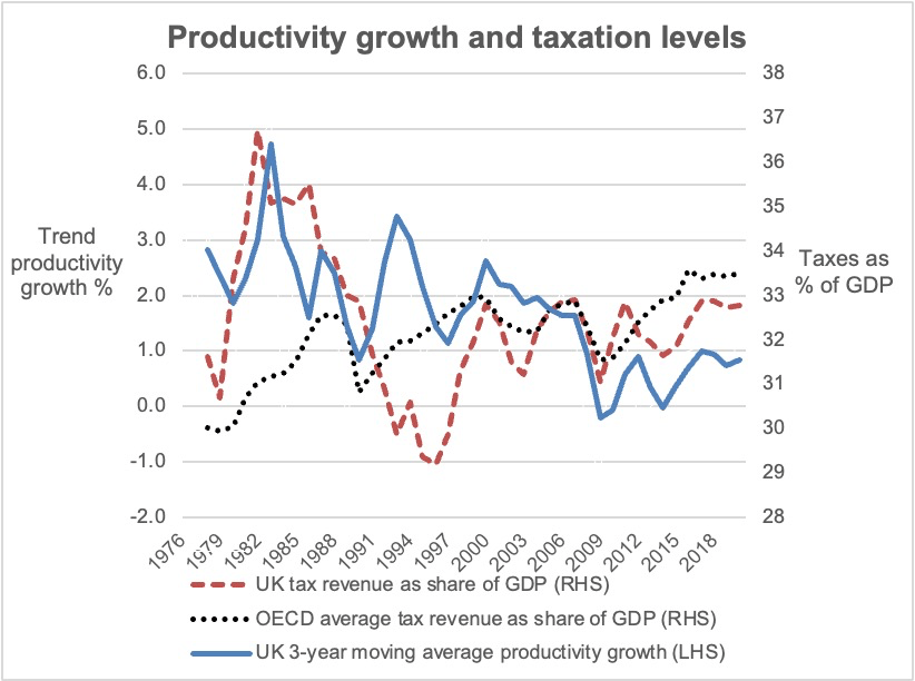 There simply is no causal relationship between tax rates and economic growth. Indeed, there is no discernable relationship between swings in taxation levels and movements in productivity, as measured by output per hour (see chart one). Productivity growth did briefly accelerate in both the early 1980s and the early 1990s. But in the first period this was accompanied by rising taxation and in the second by falling taxation.